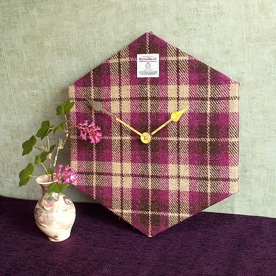 I have used the world renowned Harris Tweed® hand-woven fabic to make these unusual clocks to my own designs. They are all wall hanging, but the smaller ones could be used on a table using a suitable display stand.