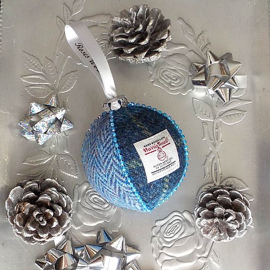 Originally my baubles were un-trimmed, but now I usually add a beaded trim, also hand-stitched along the seams. The Orb label guarantees this is genuine Harris tweed, and the Roses Workshop ribbon makes a beautiful hanging loop.